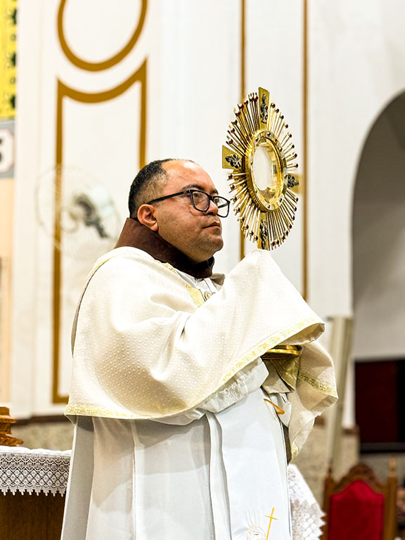 Diante de Jesus Eucarístico, os devotos de São Francisco são chamados a seguir o exemplo do Santo das Chagas: amar, adorar e servir com simplicidade e alegria.