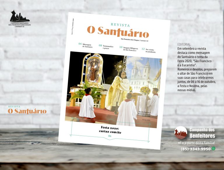 No momento, as festas de padroeiros acontecem sem a presença de público, apenas a participação presencial da liturgia da missa e da pastoral da comunicação, para evitar aglomerações. Por isso, você pode participar do novenário e das celebrações através de nossas mídias virtuais, pelo nosso canal no Youtube (Santuário de Canindé – Núcleo Televisivo NTS), pelo Facebook (Santuário de São Francisco das Chagas), e sintonizando em nossas emissoras de rádios, São Francisco AM 1.240Khz e Santa Clara FM 106,3Mhz.