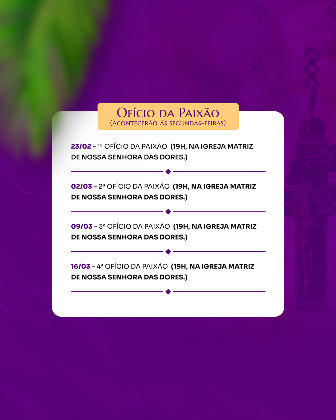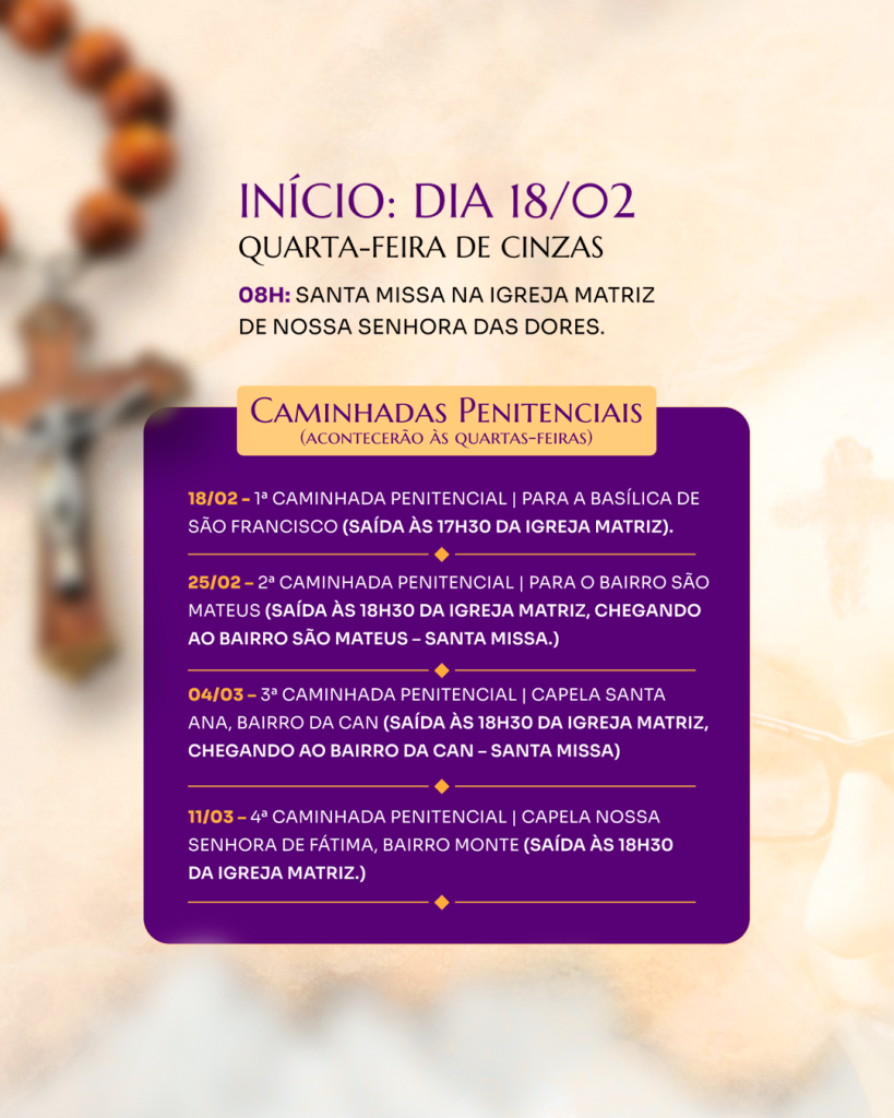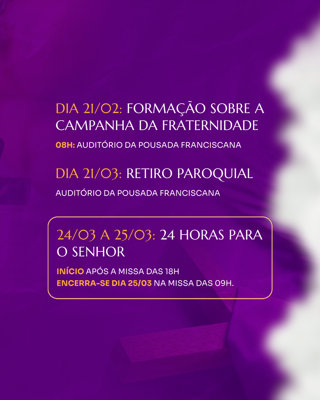 A programação completa da Quaresma e da Semana Santa está disponível nas redes sociais da Paróquia e está disponível também na Secretaria Paroquial.