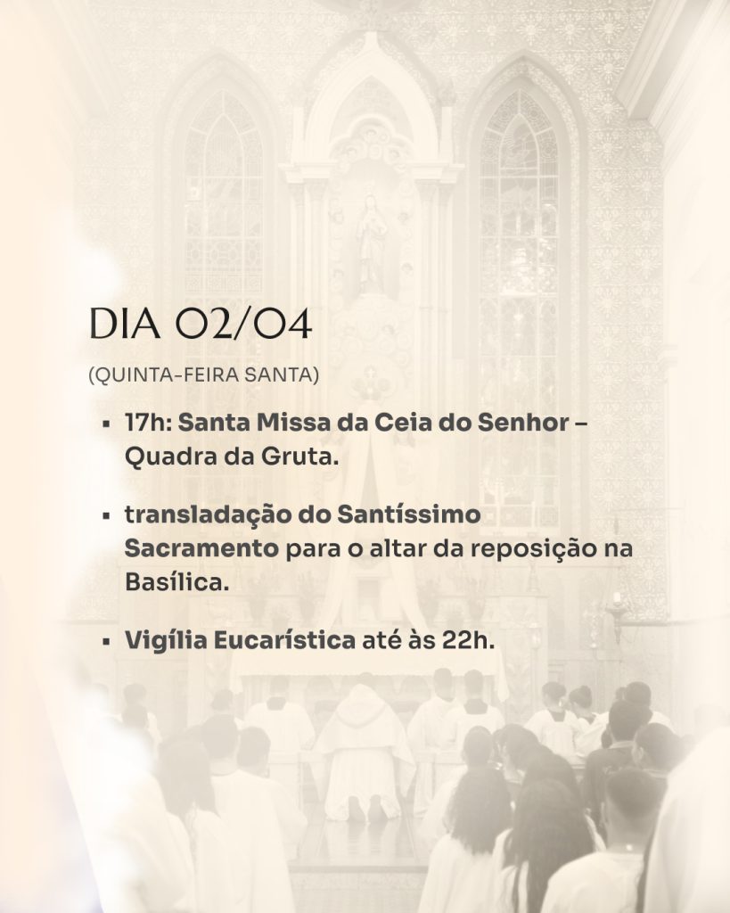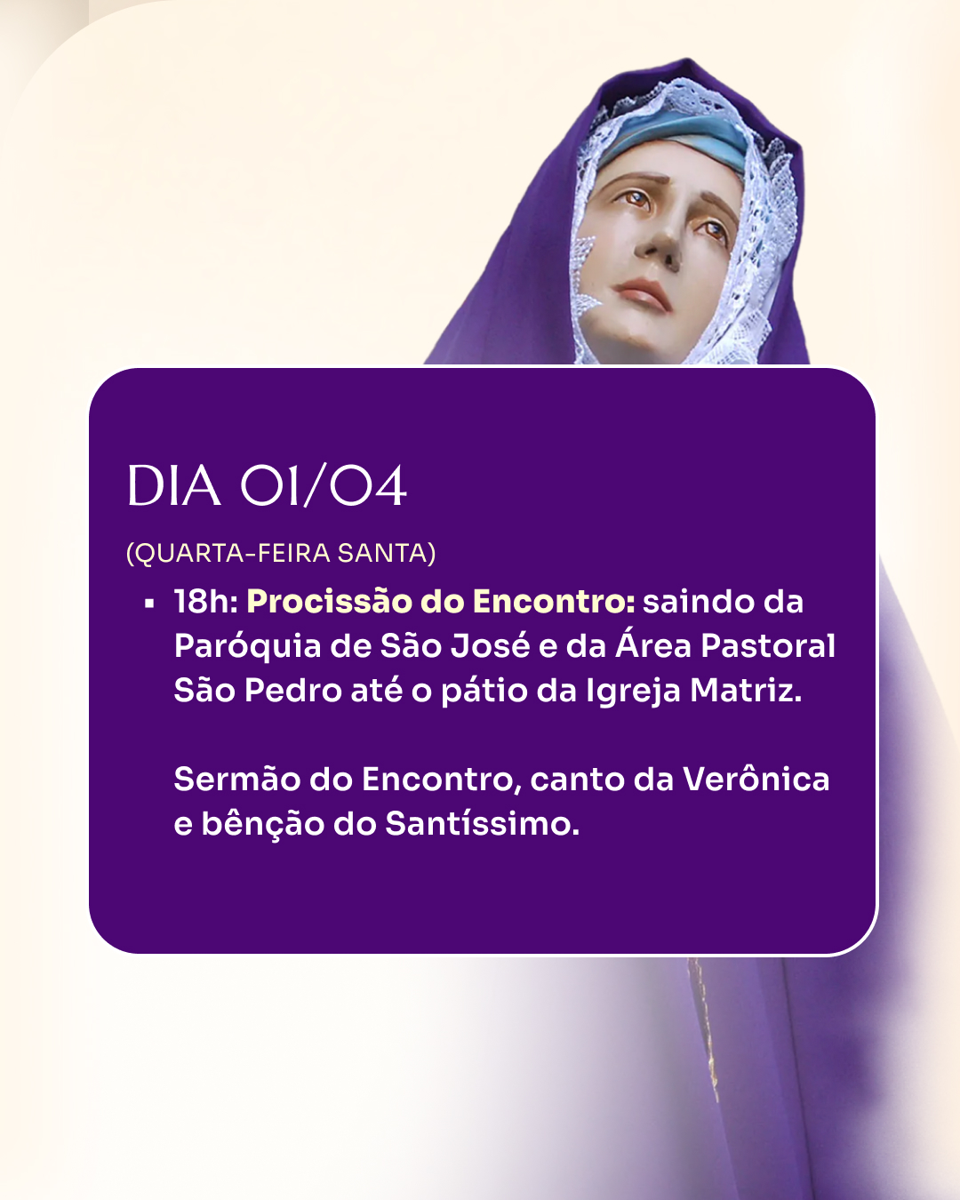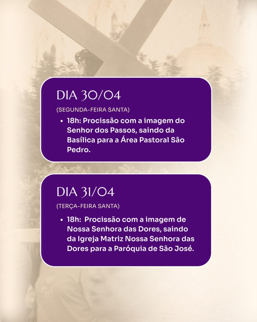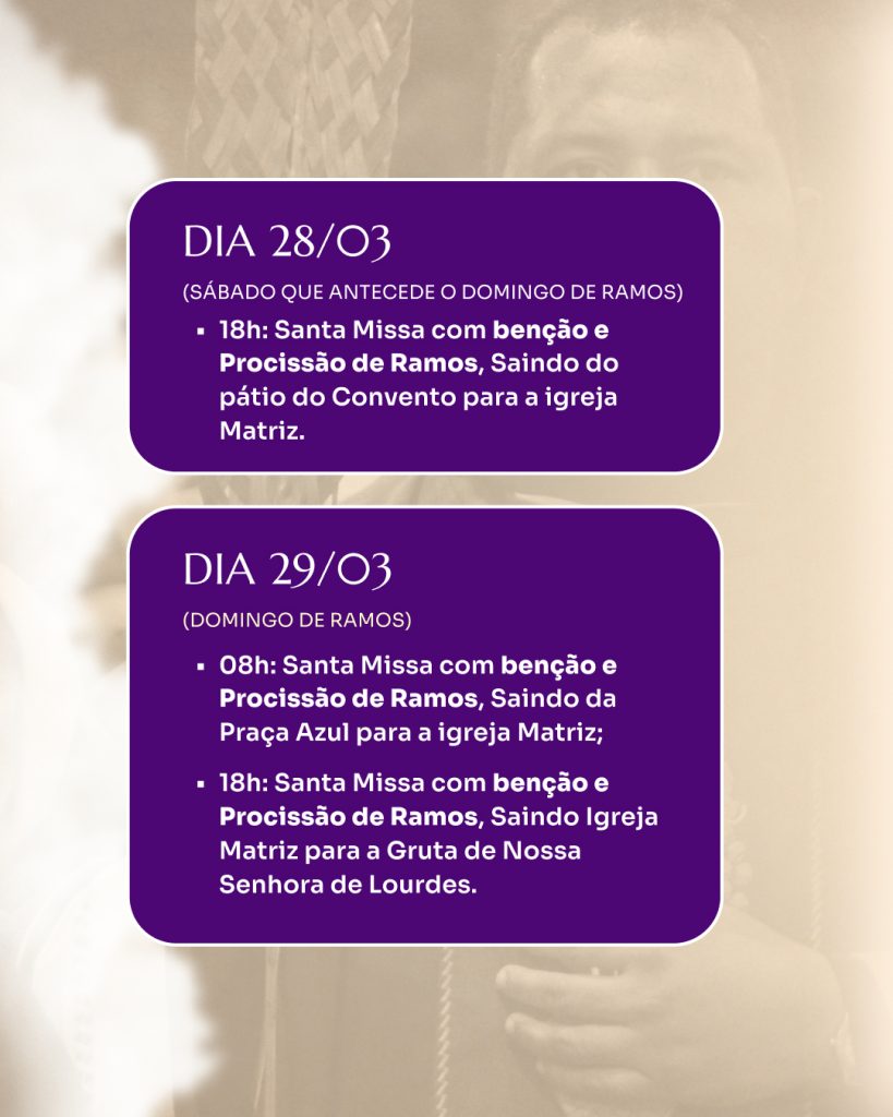 A programação completa da Quaresma e da Semana Santa está disponível nas redes sociais da Paróquia e está disponível também na Secretaria Paroquial.