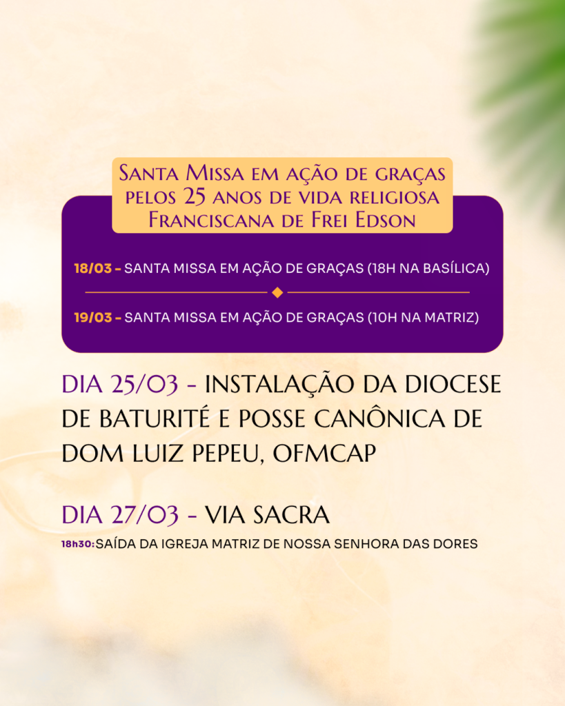Neste ano, a caminhada quaresmal será vivida em profunda comunhão com São Francisco das Chagas, cuja espiritualidade é marcada por um amor intenso e contemplativo a Cristo crucificado, e de modo especial à luz do Jubileu Franciscano, que celebra os 800 anos da morte de São Francisco de Assis. Este tempo jubilar nos convida a revisitar sua herança espiritual e a renovar nosso compromisso com uma fé encarnada, simples e profundamente evangélica.