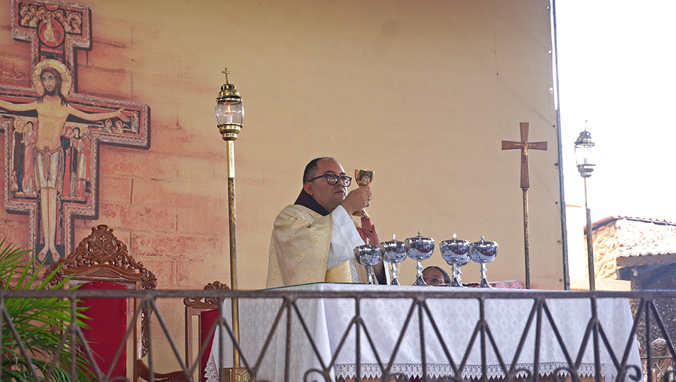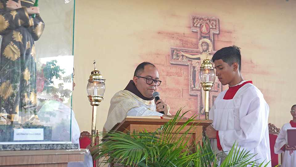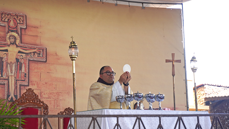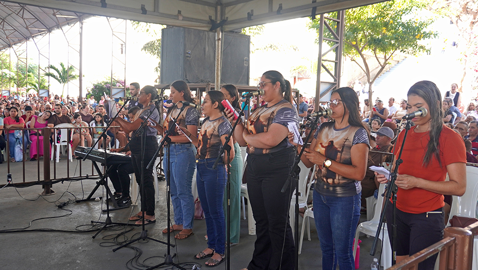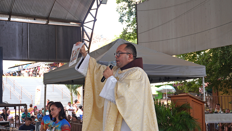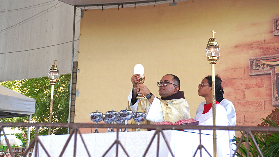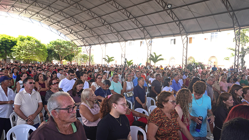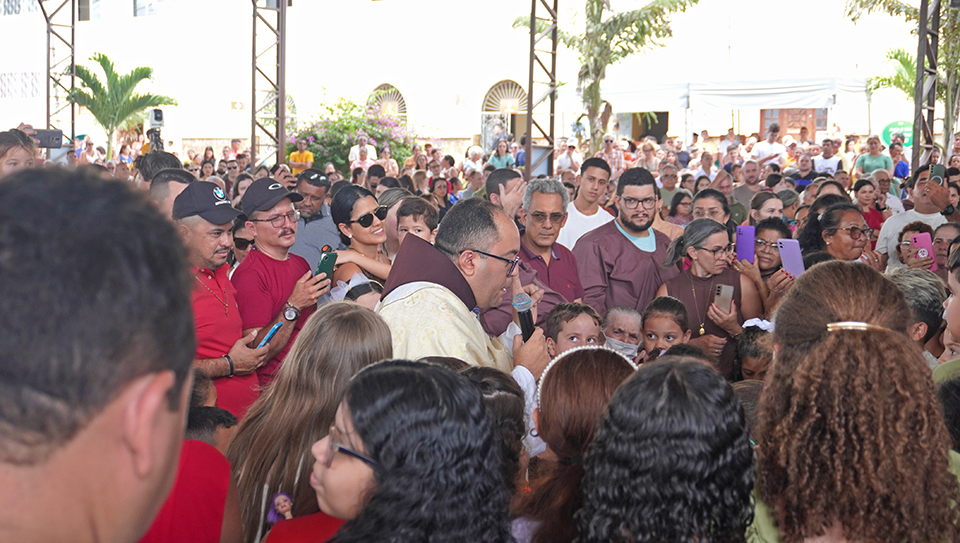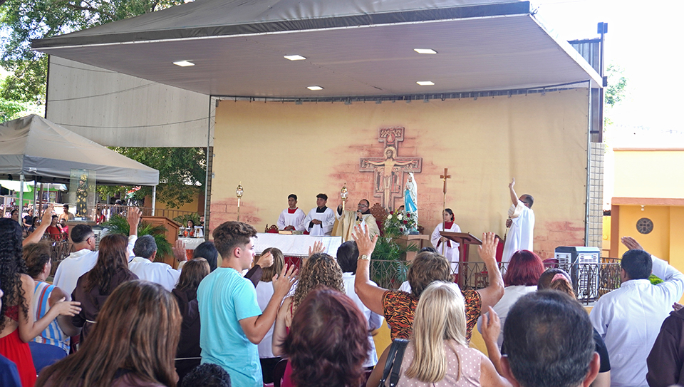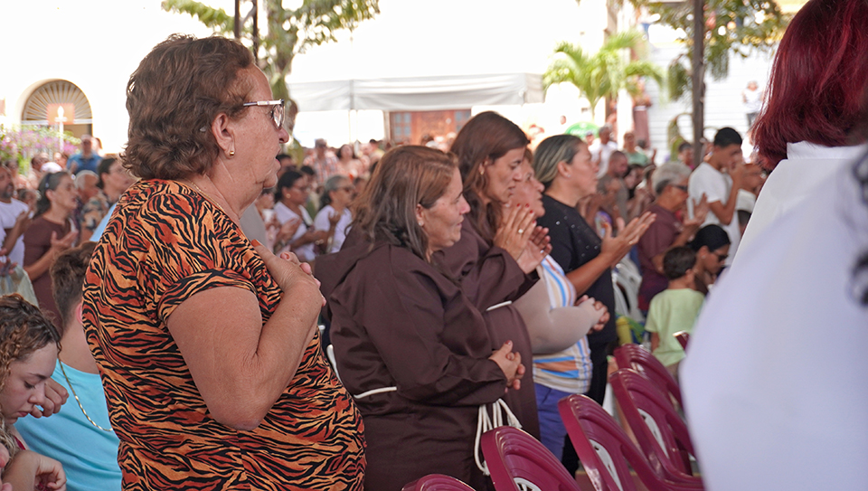 A missa foi presidida pelo Reitor do Santuário, Frei Gilmar Nascimento, OFM, e reuniu um grande número de romeiros e devotos, que lotaram a quadra da gruta, em clima de fé, alegria e profunda devoção mariana.