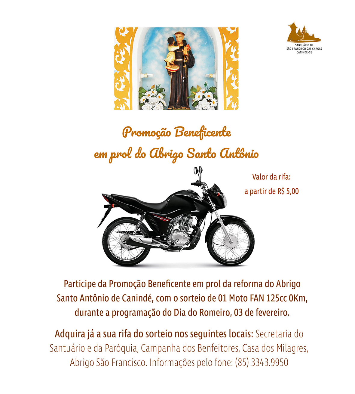 O Santuário realizará a promoção beneficente para a reforma do Abrigo Santo Antônio, com o sorteio de uma moto FAN 125cc 0km, que acontece no dia 03 de fevereiro, quando se celebra o Dia do Romeiro em Canindé.
